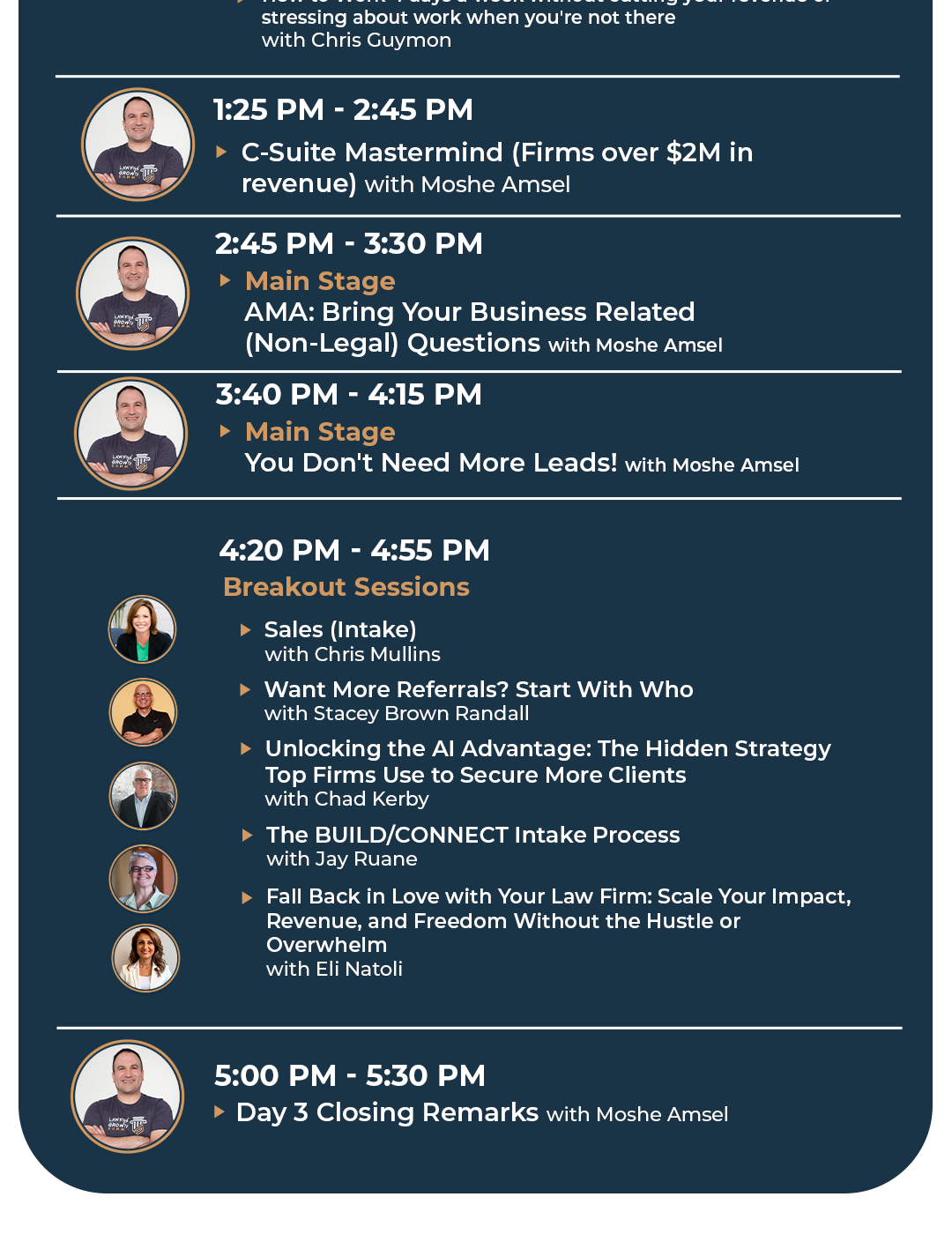 Last year, we found out that we may not have covered exactly the topics you needed if you were a little more advanced on your law firm growth journey. So we have revamped the format of the event to include topics specifically geared to 3 phases of law firm growth - Startup, Expansion, and Legacy Creator.